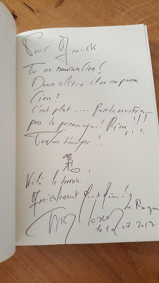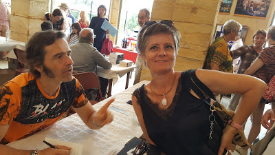 Gilles Caillot et Chris Loseus qui excelle dans la dédicace… Je vais la mettre sous verre celle-ci 😁😉 Deux auteurs de petites tailles 😂 qui du coup n’ont pas osé se lever pour la photo et nous ravissent de leurs écrits.