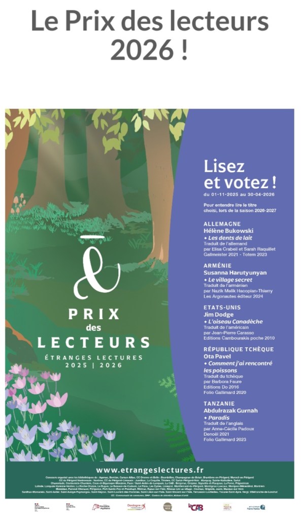 Ce prix se dĂ©roule du 1er novembre 2025 au 30 avril 2026 avec un vote des lecteurs. Nous allons partir pour l’Allemagne, l’ArmĂ©nie, les Etats-Unis, la RĂ©publique TchĂšque et la Tanzanie, en voici une chouette vidĂ©o et l’affiche… Mon premier roman choisi est « Les dents de lait » d’HĂ©lĂšne Bukowski.